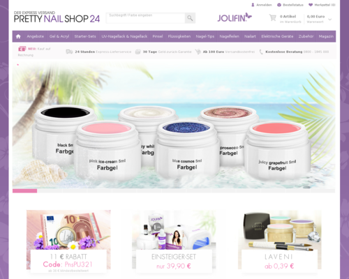 Erhalten Sie durch Gutscheine Rabatte auf das gesamte Sortiment im Prettynailshop24. Hier erhalten Sie unter anderem Startersets für eine Maniküre mit UV-Licht, Gel und Acryl, aber auch einfache Nagellacke, Feilen, Pinsel und Sticker von der Eigenmarke Jolifin. Mit einem Prettynailshop24-Gutschein profitieren Sie von exklusiven Rabattvorteilen.